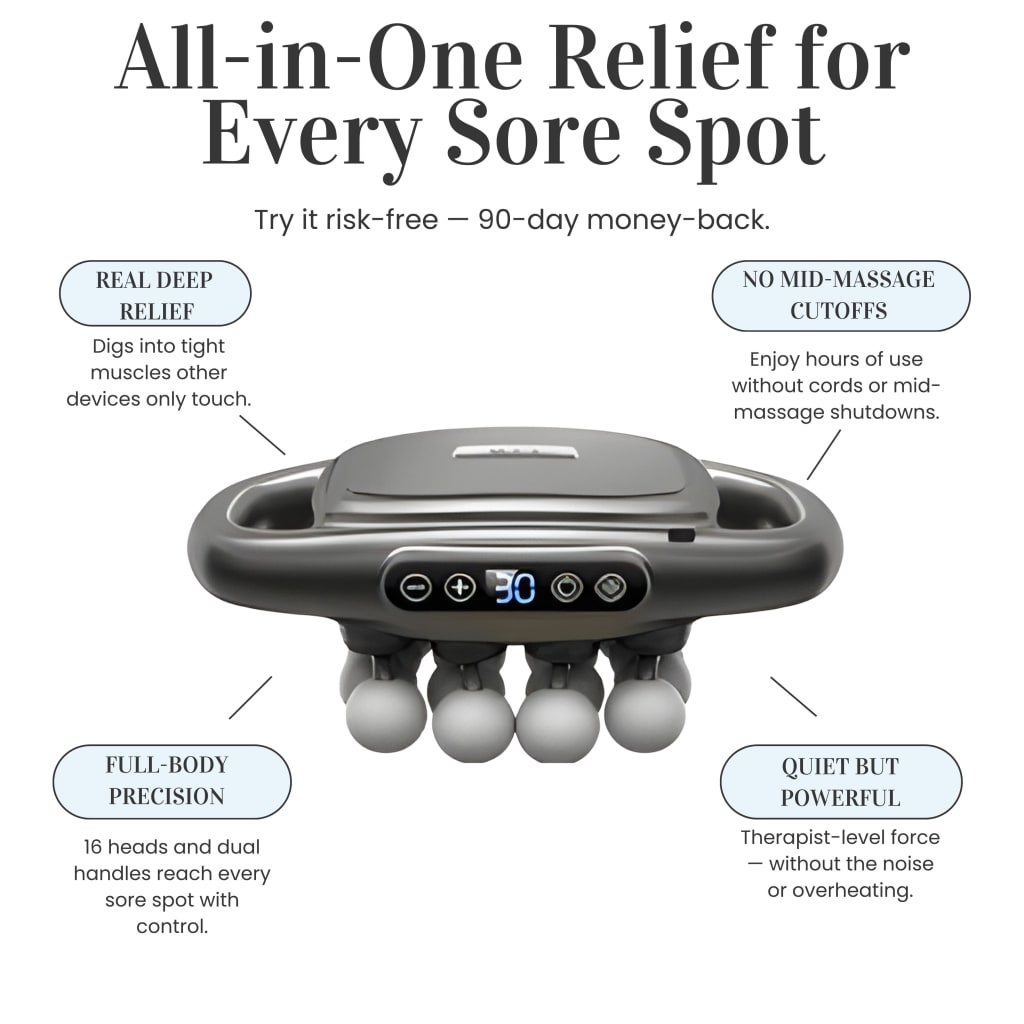 - Our multi-head electric massager changes that instantly. Six attachments target every sore spot, with adjustable speeds for soothing or deep tissue relief. In minutes, stiffness fades and your body feels free again!!